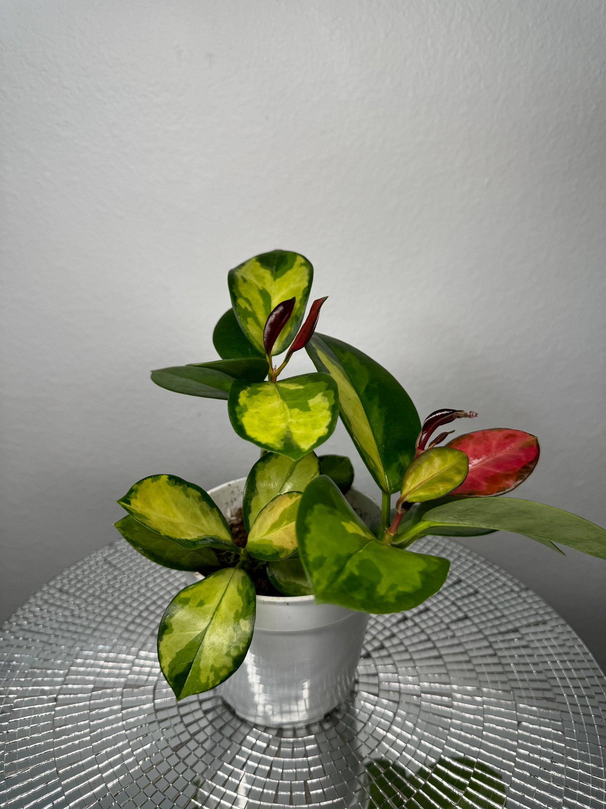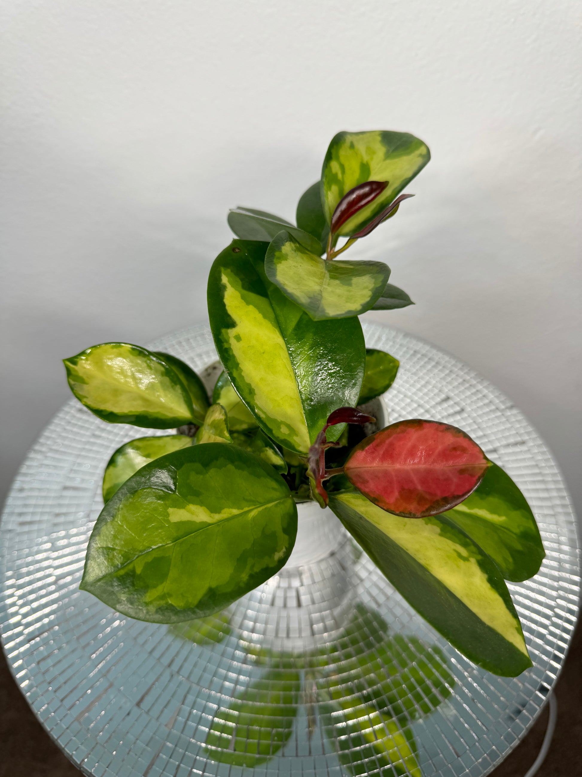 Hoya Australis ‘Lisa’ is a trailing hoya that can produce leaves with dark green, lime green, creamy yellow, dark red, and even soft peach tones.